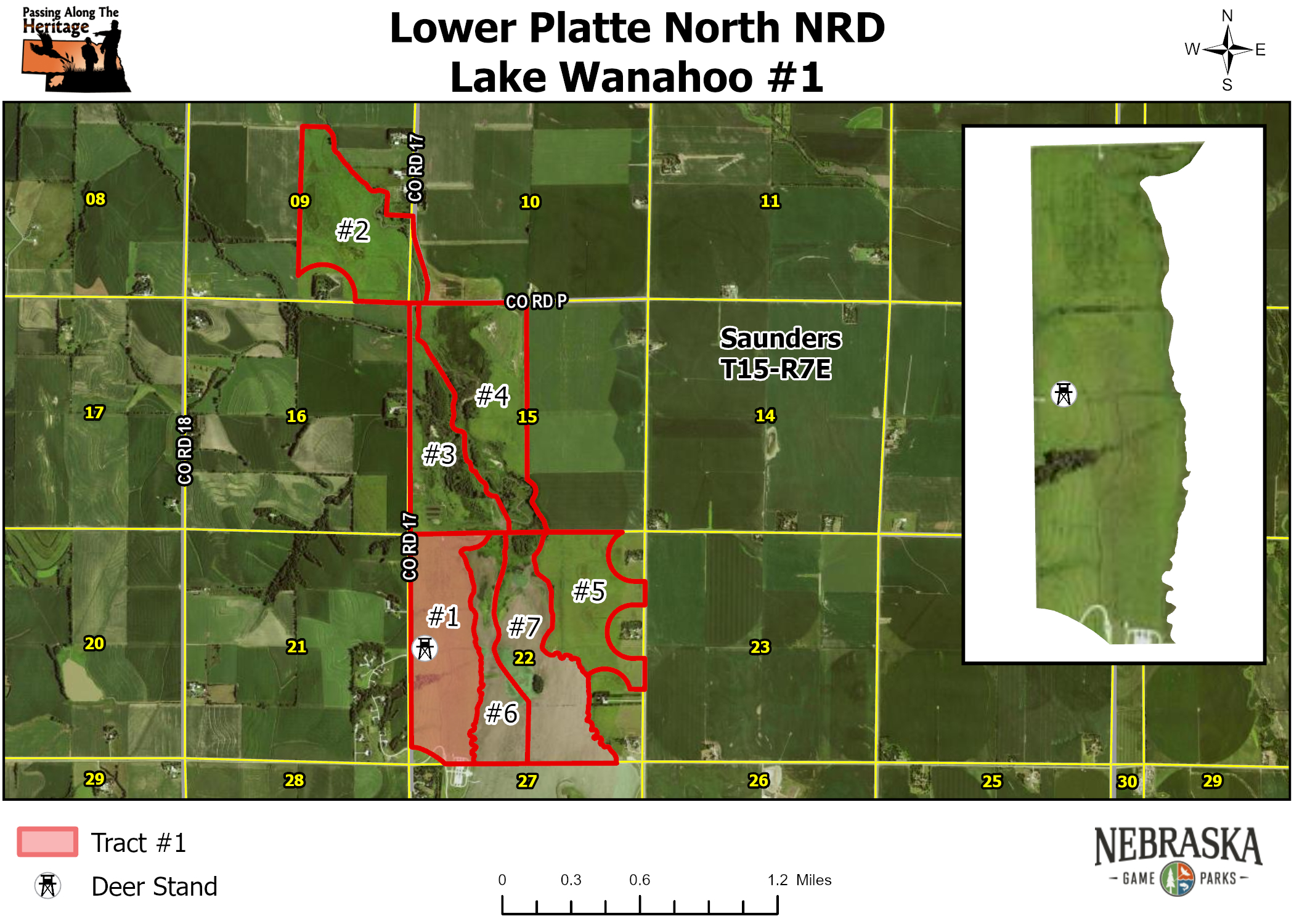 Saunders County Tract: 1/4 SE, Section: 9, Township: 15 North, Range: 7 East. Property located north of Wahoo, Nebraska. From the intersection of highways 109, 92, and 77 travel north 3 miles, then west 1+mile to access (Located north and west of County Road P and 17); tract on north side of road marked with blue PATH signs. - Up to 2 youth hunters in one hunting group allowed, with the exception of deer hunting where only one youth hunter is allowed. If an individual hunting party has two youth hunters in the field at the same time then the following information must be written on the "Land Access Form" carried in the field: Both hunter names with DOB (Date of Birth) and both legal guardians' signatures, if not the same parent or guardian. - ALL SPECIES hunting allowed within season. - New deer blind east of creek to be placed in 2024. - During the rifle deer season, November 15-23, this area can be reserved for youth rifle deer hunting only (no other hunting activities allowed). Hunters and mentors are advised to know what is down range from your quarry before shooting. - Walk-in only; No vehicle access. - No target or trap shooting; No handguns. - No trapping allowed. - Steel shot is required for waterfowl hunting. - Only temporary blinds or stands are allowed. - Park in designated parking areas, field accesses, or at a safe location along the County Road. - Non-hunting, general public, access is open beginning March 1. This includes the Spring Turkey Season. - SPECIAL NOTES: There is a 200-yard hunting restriction around the southwest corner of this unit. Hunt north of posted signs. NRD Park Permit not required in areas north of county road N. Portions of this area may have been hayed as part of site management. There is still adequate, un-hayed habitat available to hunt. WANAHOO #2