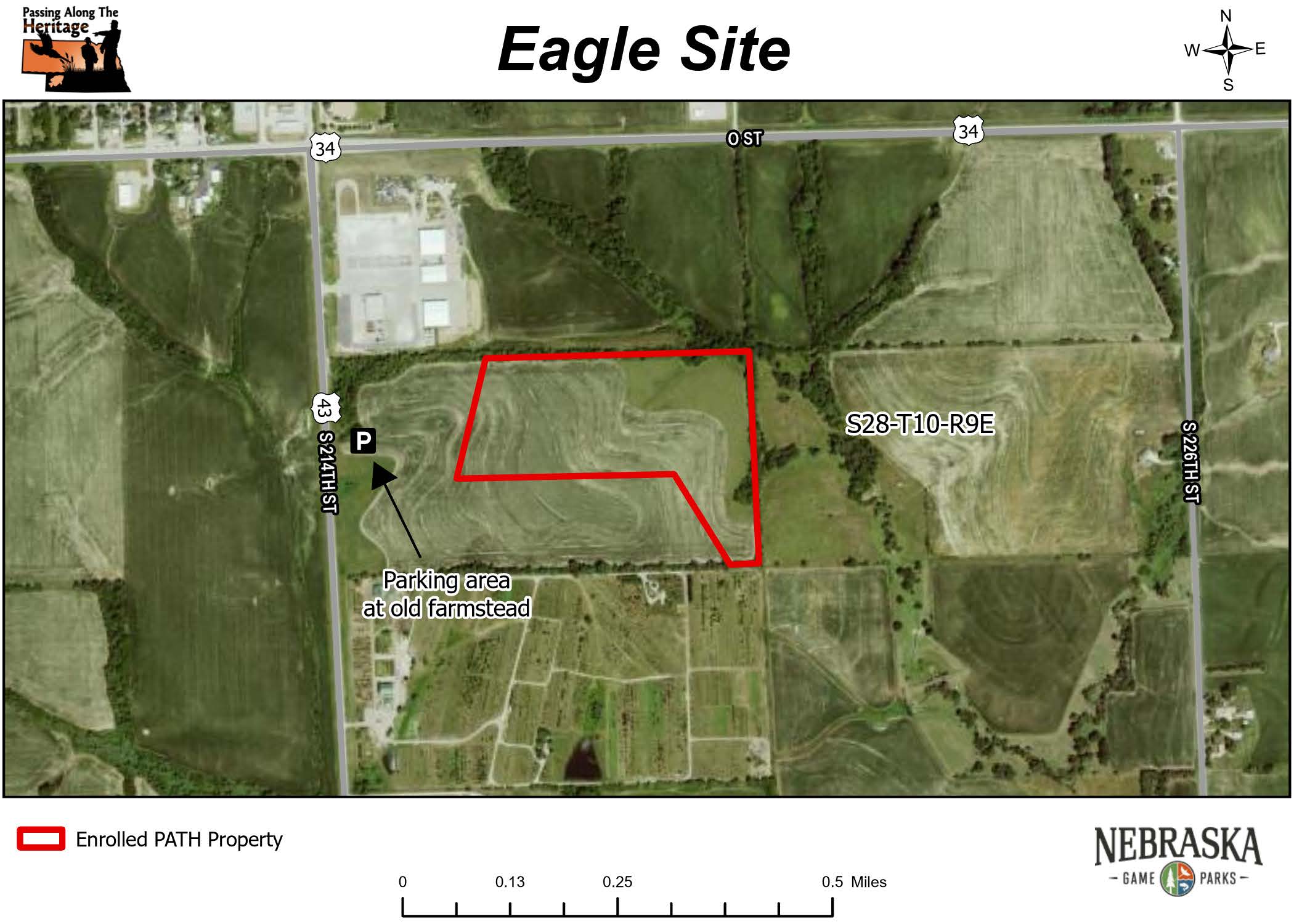 Driving directions from nearest town: 3/8 miles south of Eagle, NE; Approximately 3/8 miles south of Highway 34/0 Street, on Highway 43/214th Street; ~50 huntable acres of CRP-grassland, wooded fenceline, and cropland habitat. Species/types of game allowed: All species within season, including Pheasant, Rabbit, Squirrel, Quail, Deer, Dove. Days allowed: All days within season beginning September 1 and ending May 31. SPECIAL RESTRICTIONS/INSTRUCTIONS: - Weapons are restricted to Archery and Shotgun only on this site. - Please park at the old farmstead access. Do not park along the highway shoulder. No vehicle access, walk-in hunting only. - There are exclusion areas on this property that include parts of the north, south, and west boundaries. By statute, you may walk through these areas, but you are not allowed to shoot at game. Familiarize yourself with the map for this area and respect neighboring landowners. There is a trucking company north of this tract and a tree farm to the south, so expect people to be present. Be cognizant of Highway 43 traffic and maintain control of your dog, if used while on this site. - Do not Trespass on neighbors! - This is an active farm, so avoid damaging crops while accessing if prior to harvest. - Up to 2 youth hunters in one hunting group allowed, with the exception of deer hunting where only one youth hunter is allowed. If an individual hunting party has 2 youth hunters in the field at the same time then the following information must be written on the permission slip carried in the field: Both hunter names with DOB (Date of Birth) and both legal guardians' signatures, if not the same parent or guardian. An "observer" is also allowed; Only youth hunters may carry a gun or hunt on PATH sites; Do not forget to print and carry your PATH registration/permission slip. - No target or trap shooting is allowed. EAGLE SITE