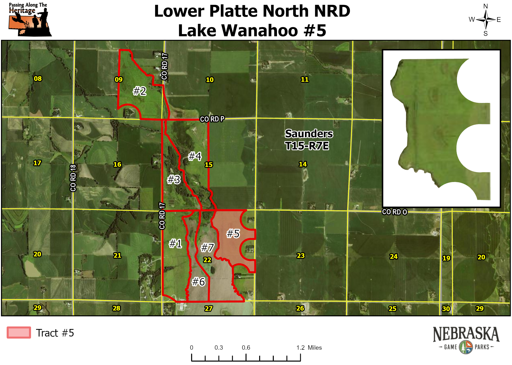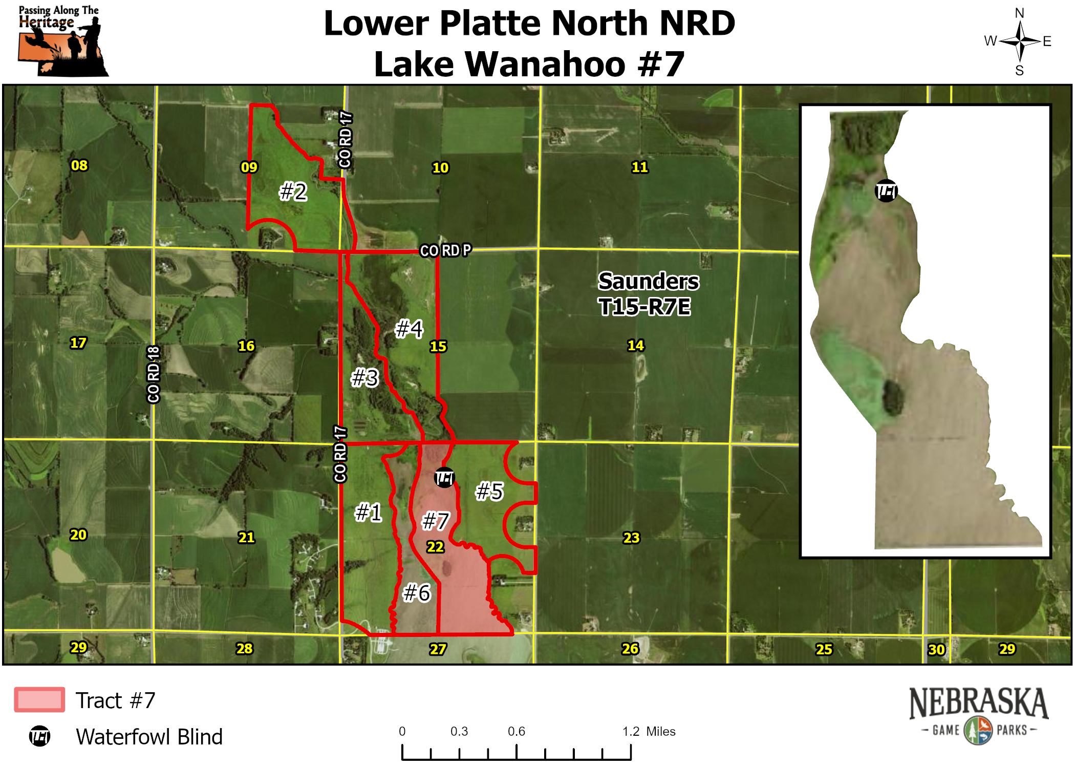 Saunders County. Tract 1/4 NW. Section 15. Township 15 North. Range 7 East. Located north of Wahoo, Nebraska. From the intersection of highways 109, 92, and 77 travel north 2 miles, then west 1/2 mile to access; tract on north side of road marked with blue Path signs; OR, travel north 3 miles, then west 1/2 mile to access; tract on south side of road (Located between County Roads O and P, east of Sand Creek). - Up to 2 youth hunters in one hunting group allowed, with the exception of deer hunting where only one youth hunter is allowed. If an individual hunting party has two youth hunters in the field at the same time then the following information must be written on the "Land Access From" carried in the field: Both hunter names with DOB (Date of Birth) and both legal guardians' signatures, if not the same parent or guardian. - ALL SPECIES hunting allowed within season. - CAUTION! Deep water associated with flooded creek channel. - A 14-acre wetland enhancement in the north 1/2 of Area 4 was completed in 2024. - Tower blind available in the south 1/2 of Area 4, mowed path or trail to the blind from North or South, County Roads O and P. During the rifle deer season, November 15-23, this area can be reserved for youth rifle deer hunting only (no other hunting activities allowed). Hunters and mentors are advised to know what is down range from your quarry before shooting. Please be advised that bank fishing is allowed to the public during this timeframe. - Hunt east of creek only. - Walk-in only; No vehicle access. - No target or trap shooting; No handguns. - No trapping allowed. - Steel shot is required for waterfowl hunting. - Only temporary blinds or stands are allowed. - Park in designated parking areas, field accesses, or at a safe location along the County Road. - Non-hunting, general public, access is open beginning March 1. This includes the Spring Turkey Season. - Non-hunting, general public, access for fishing is open year-round on the lake and along the bank. - SPECIAL NOTES: South woodland/wetland complex restricted due to active Bald Eagle nest. Obey posted signs on site. There is a 200-yard hunting restriction around the north-east corner of this unit. Hunt south of posted signs. NRD Park Permit not required in areas north of county road N. Portions of this area may have been hayed as part of site management. There is still adequate, un-hayed habitat available to hunt. WANAHOO #4